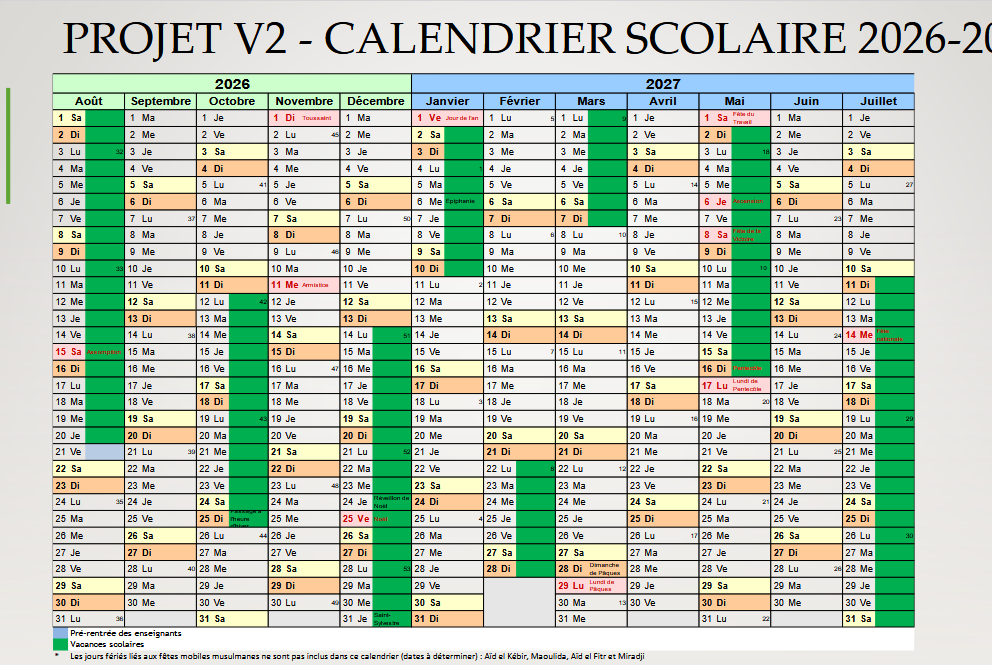2 semaines de vacances en octobre , février-mars et mai. Les deux années scolaires suivantes devraient conserver la durée de ces semaines de vacances. Pour que cela soit officiel, il faut attendre que le Préfet valide ce calendrier.