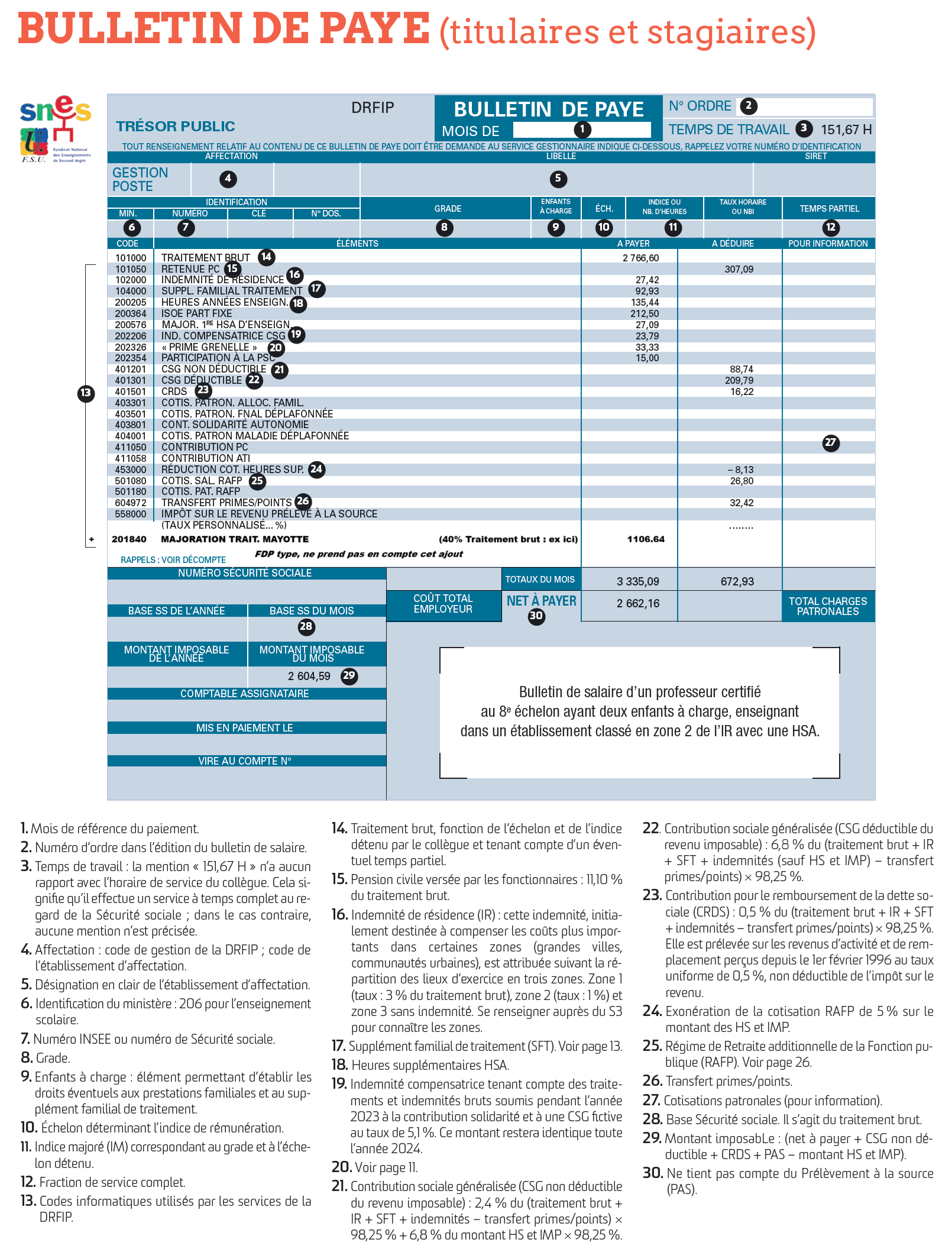 Ce dossier explique les éléments essentiels qui composent la rémunération des personnels de l’Éducation nationale : traitement indiciaire, indemnités, cotisations, primes, mais aussi les spécificités selon les statuts (certifiés, agrégés, AED, AESH, contractuels…). Illustré d’exemples de bulletins de salaire, il permet d’identifier les lignes principales, de comprendre ce qui relève du brut, du net, des prélèvements sociaux, du PAS, ainsi que les droits liés à la carrière (ISOE, SFT, HSA, indemnités REP/REP+…). Un outil clair pour mieux comprendre ses droits et repérer d’éventuelles erreurs.