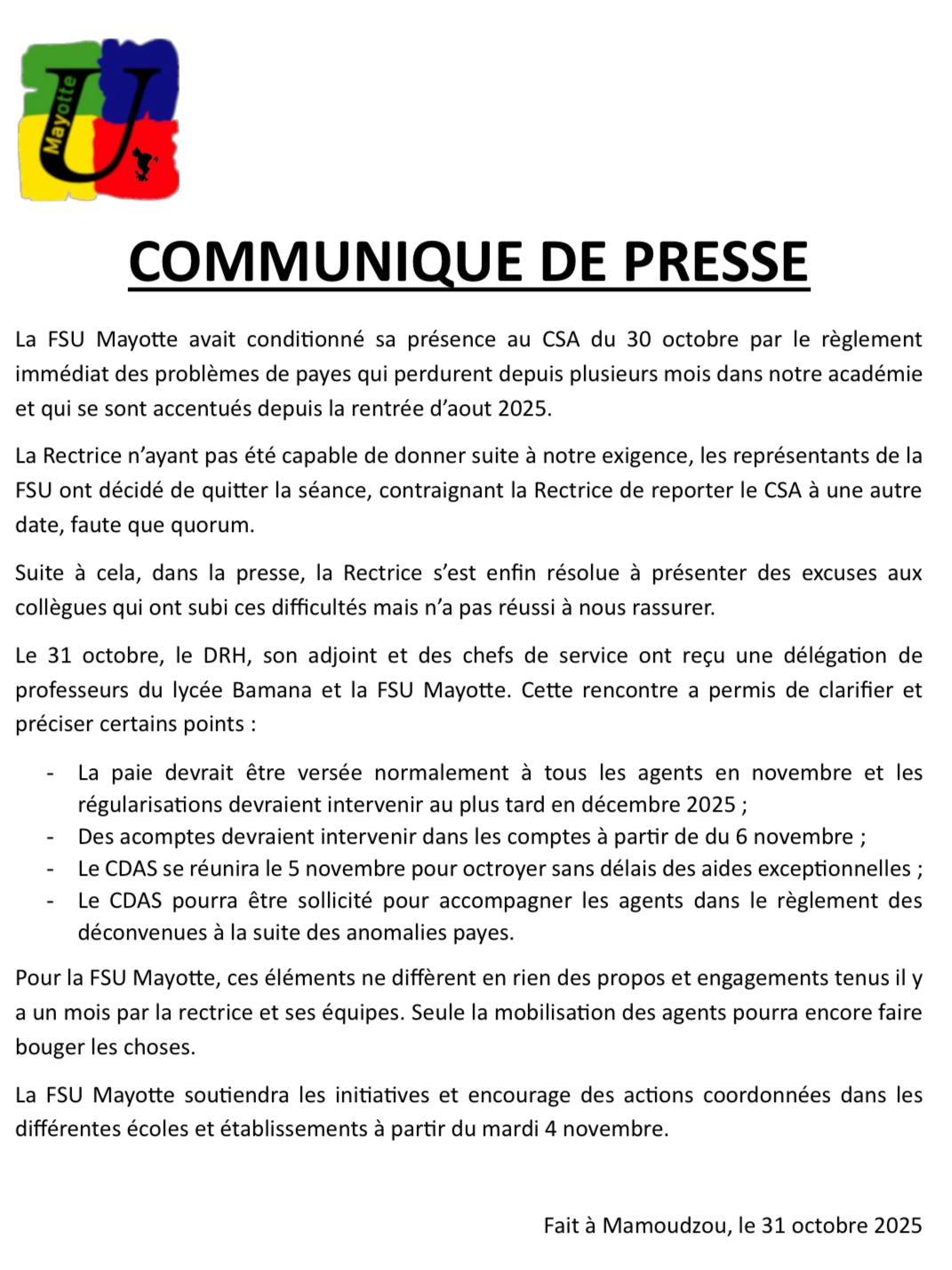 La FSU Mayotte avait conditionné sa présence au CSA (Comité Social d’Administration — instance de dialogue social entre le rectorat et les représentants des personnels, ndlr). du 30 octobre par le règlement immédiat des problèmes de payes qui perdurent depuis plusieurs mois dans notre académie et qui se sont accentués depuis la rentrée d’aout 2025.