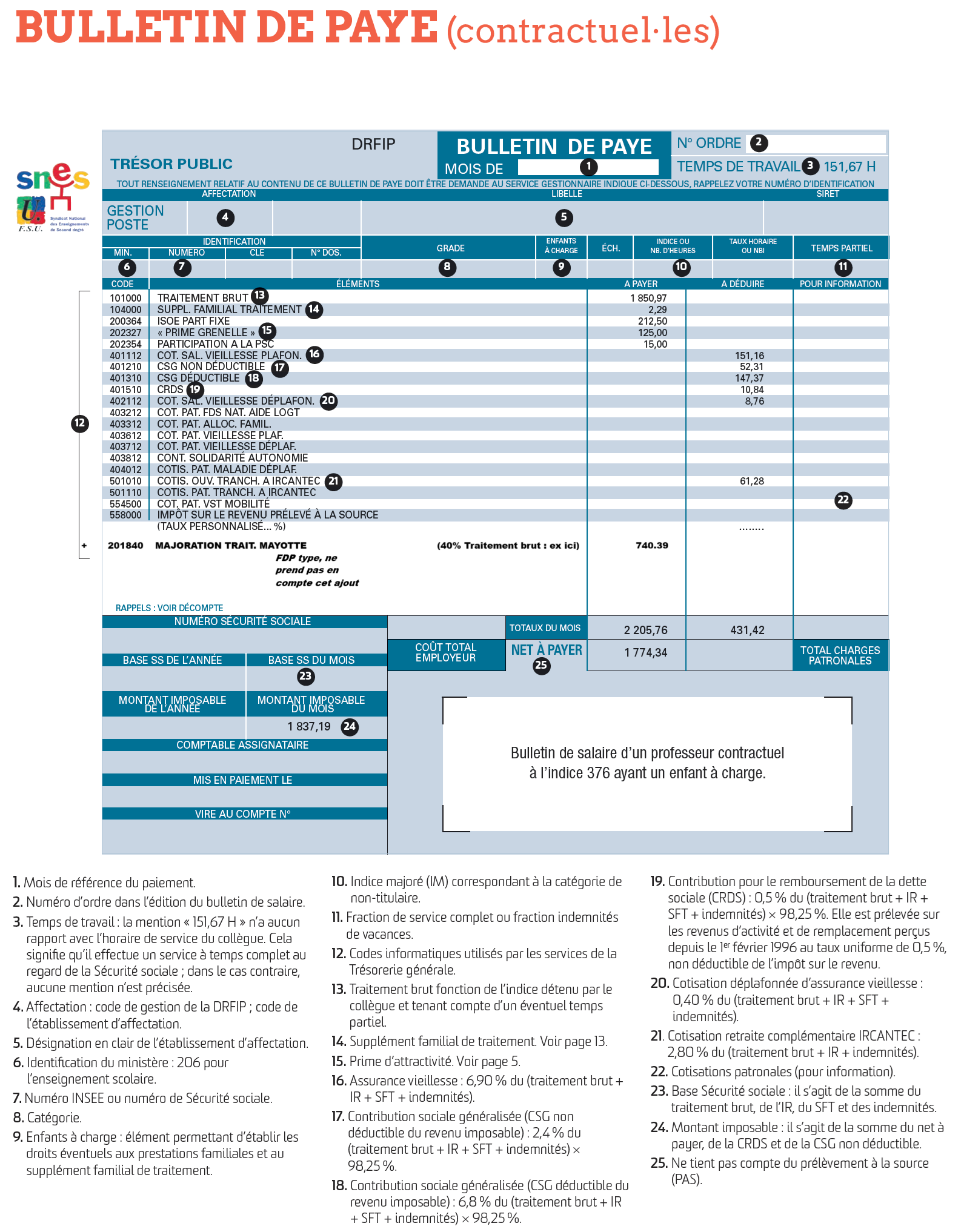 Ce dossier explique les éléments essentiels qui composent la rémunération des personnels de l’Éducation nationale : traitement indiciaire, indemnités, cotisations, primes, mais aussi les spécificités selon les statuts (certifiés, agrégés, AED, AESH, contractuels…). Illustré d’exemples de bulletins de salaire, il permet d’identifier les lignes principales, de comprendre ce qui relève du brut, du net, des prélèvements sociaux, du PAS, ainsi que les droits liés à la carrière (ISOE, SFT, HSA, indemnités REP/REP+…). Un outil clair pour mieux comprendre ses droits et repérer d’éventuelles erreurs.