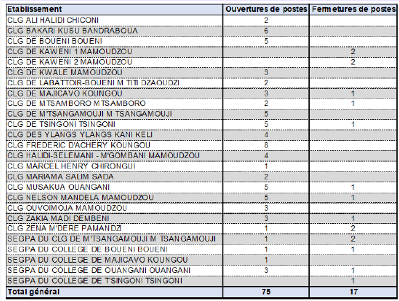 Le bilan global solde 93 postes crées pour les collèges et lycée. (Il y a plus de poste en philosophie crée à Chirongui)