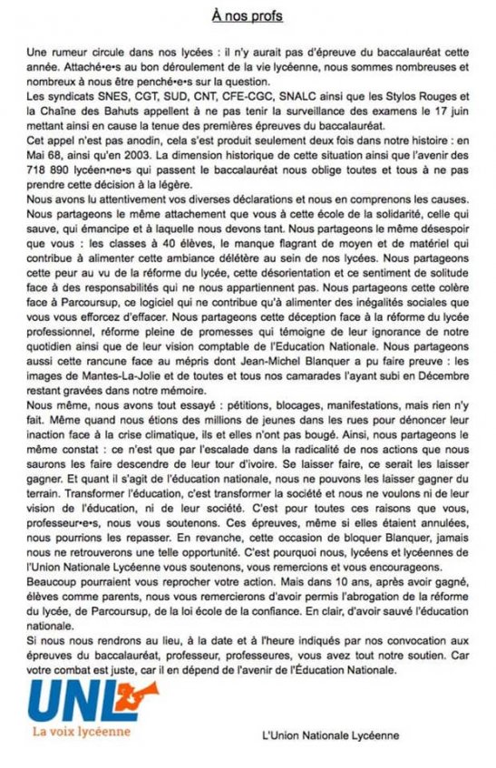 Lettre de l’Union Nationale Lycéenne « À nos profs » quant à la grève du #17juin.
