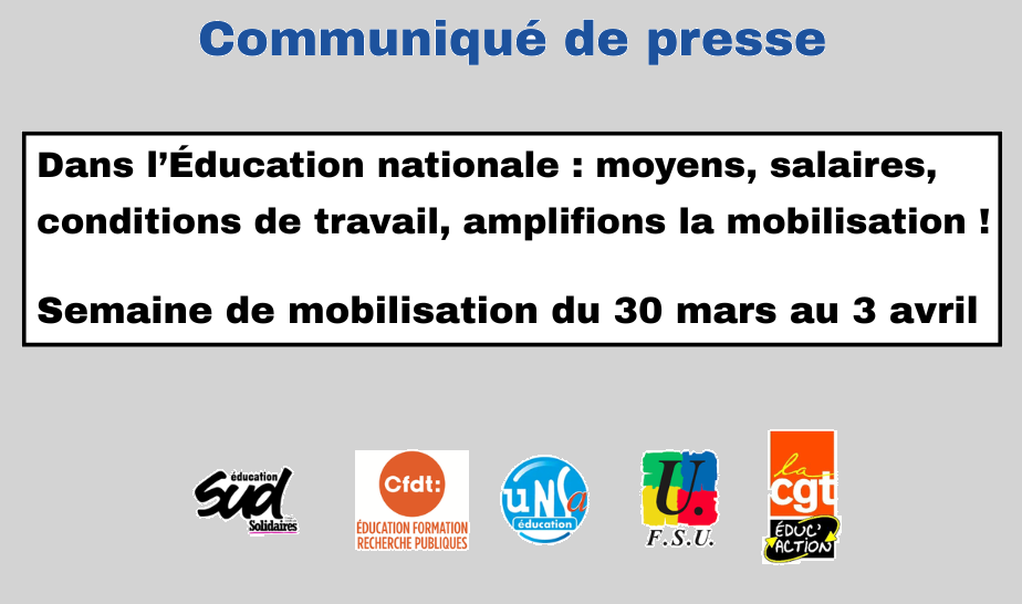 Face à la dégradation des conditions de travail, à l’insuffisance des moyens et à la stagnation des salaires, la FSU (dont fait partie le SNES-FSU), l’UNSA Éducation, la CFDT Éducation Formation et Recherche Publiques, la CGT Educ’Action et SUD Éducation appellent à la mobilisation la semaine du 30 mars au 3 avril prochain, et à la grève le mardi 31 mars. Ci-dessous le communiqué national de l’intersyndicale. Mise à jour locale à venir.