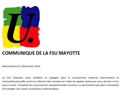 La FSU Mayotte reste solidaire et engagée dans le mouvement national intersyndical et interprofessionnelle contre la réforme des retraites et relaie les appels nationaux pour demain et les jours à venir. Toutefois les circonstances exceptionnelles récentes ne permettent pas dans l’immédiat d’envisager une action centralisée à Mamoudzou.
