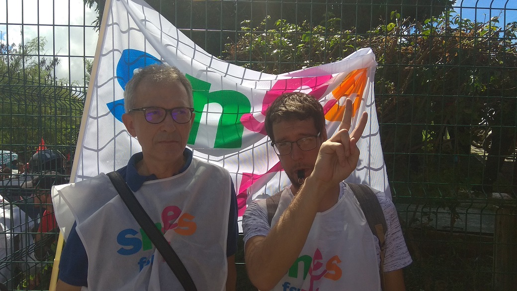 A l’exception du Sgen-CFDT et du SE-Unsa, l’ensemble des syndicats de l’éducation nationale (1er et 2nd degré) ainsi que les Stylos Rouges et une vingtaine de Gilets Jaunes, se sont donnés rendez-vous à 8h30 devant le Vice-Rectorat pour se faire entendre aux sons de sifflets, cornes de brumes...